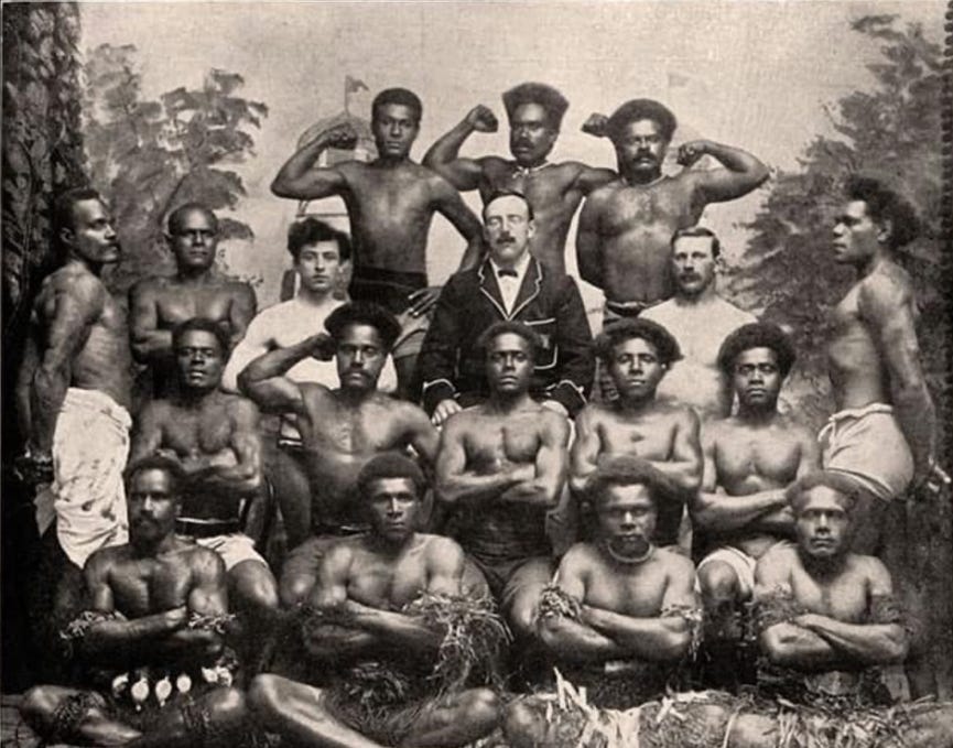 That sounds odd, given the context. These were men being trained in Fiji at the turn of the twentieth century, photographed as evidence of a successful physical culture system. Specifically Eugen Sandow‘s physical culture system. You might expect something more striking. Something exoticised. Something clearly different. Instead, what you get is something very ordinary. If you cropped the background and removed a few clues, the photograph could sit almost anywhere. A gym in Britain. A YMCA space in the United States. A school hall in Australia. The bodies do not seem anchored to place. That bothered me more than if they had looked unusual. Hornibrook was training men whose daily lives were very different from the men reading about physical culture in Britain or Ireland. Different work. Different food. Different rhythms to the day. And yet the bodies he chose to show looked as if they belonged to the same narrow category. Upright. Balanced. Controlled. Strong without excess.